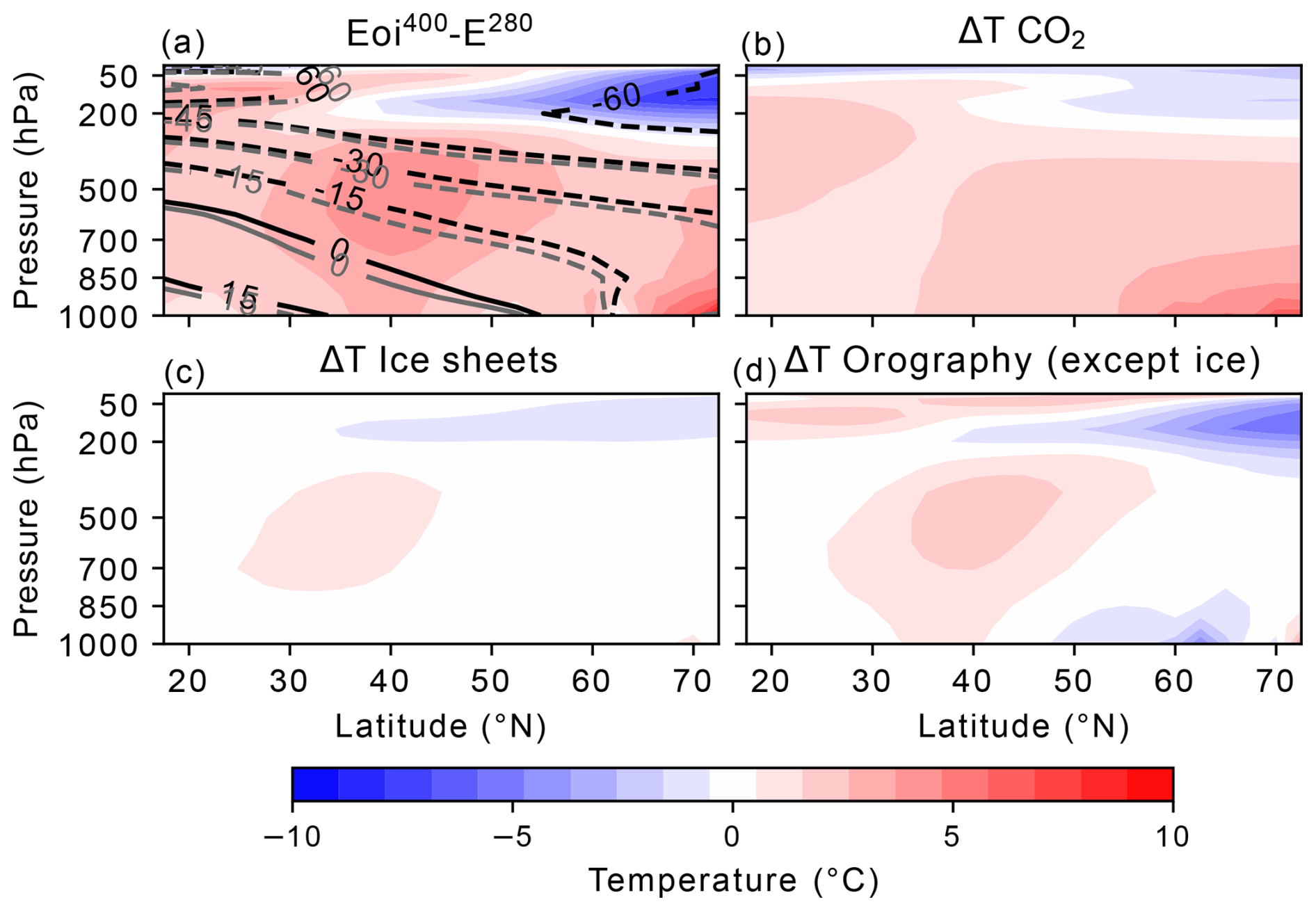Figure 6Change in boreal winter (DJF), zonally averaged, North Pacific temperature profile between the Late Pliocene (Eoi400) and the Pre-industrial (E280) in HadCM3 and the contribution of the change from CO2, ice sheet and orography forcings to the total change. In plot (a), the grey contours represent the E280 values and the black contours represent the Eoi400 values, and dashed lines indicate negative values.