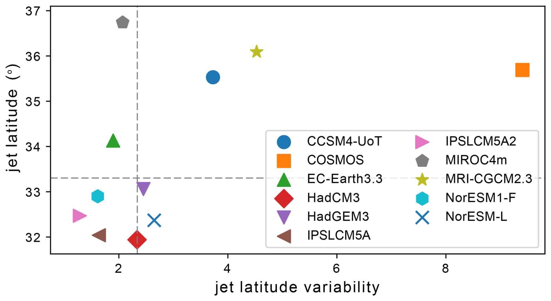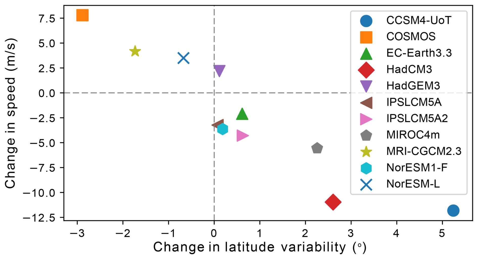 Figure 9Change in the mean speed of the January North Pacific jet stream and the change in the variability of the jet stream position. Each model in the ensemble is labelled. The dashed grey lines divide the graph into quadrants, where the upper left section shows models with an increased speed and decreased variability and the lower right quadrant contains models with a slower speed and increased variability.