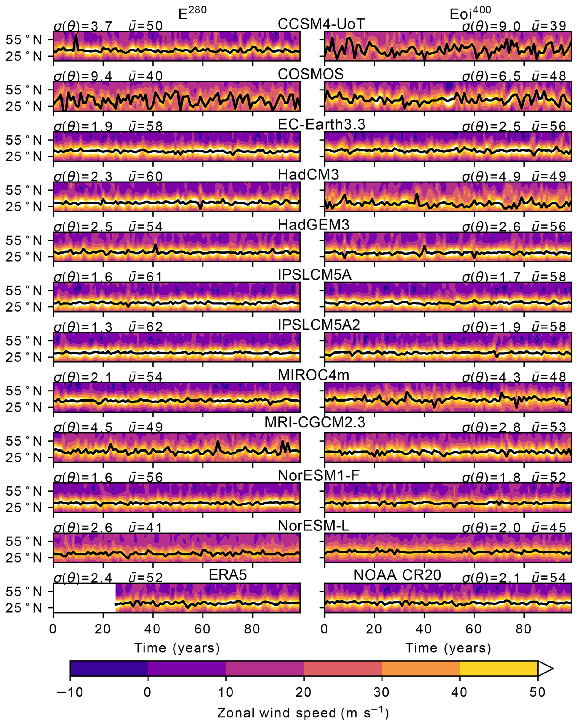 Figure 8Hovmöller diagrams for the zonal mean wind speed at 200 hPa in January for 100 years for the North Pacific. The left-hand side is from the E280 (pre-industrial) experiments and the right-hand side is from the Eoi400 (Late Pliocene) experiments with the exception of the bottom two panels which show the reanalysis data. The black line indicates the latitude of maximum zonal wind speed. The standard deviation in the latitude (σ(θ)) and mean maximum zonal wind speed () are shown for each subplot.