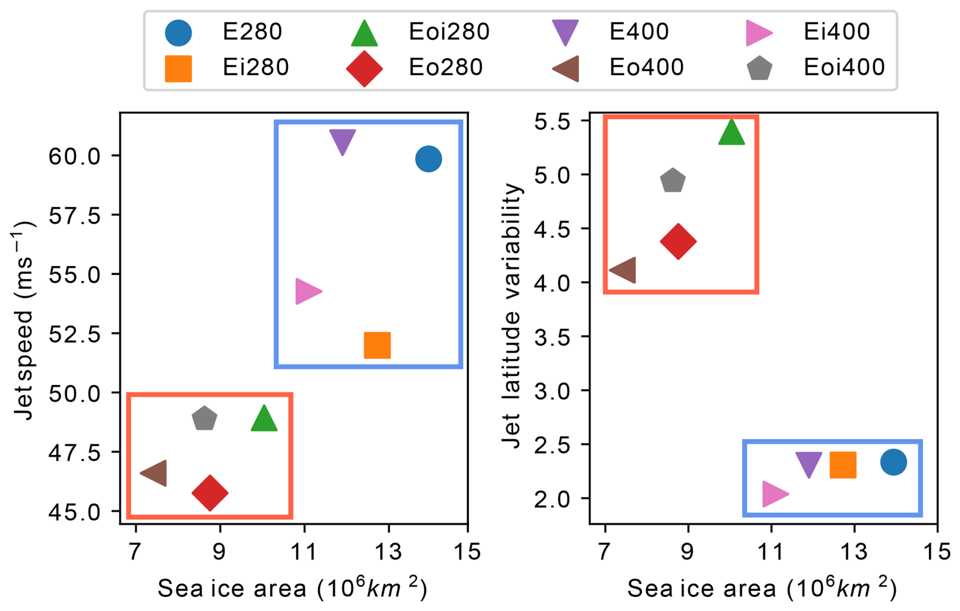 Figure 11January Northern Hemisphere sea ice area and January North Pacific jet stream speed (left), and jet latitude variability (right) at 200 hPa in HadCM3. The red box groups experiments with Late Pliocene orography and the blue box groups experiments with pre-industrial orography.