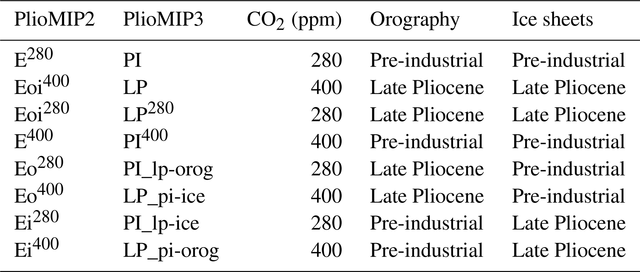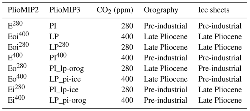 Table 1Boundary conditions from a selection of PlioMIP2 runs. These simulations are set up following the PlioMIP2 guidance (Haywood et al., 2016) and overlap with the PlioMIP3 experimental design (Haywood et al., 2024). We include the experiment names for both PlioMIP2 and PlioMIP3 to allow for comparison between both phases. Here, orography also includes vegetation and land–sea mask changes.