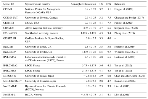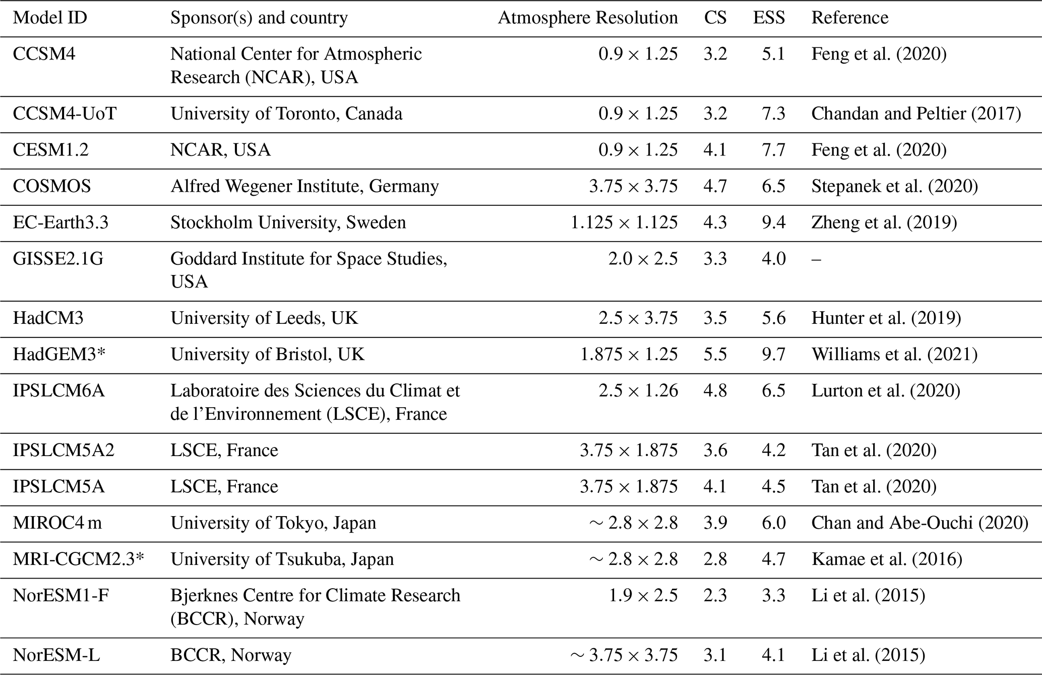 Table 2The PlioMIP2 models used in this study. The Climate Sensitivity (CS) and Earth System Sensitivity (ESS) are taken from Haywood et al. (2020) and Williams et al. (2021). Models with an asterisk (*) use the land sea mask of the pre-industrial control simulation (E280) for the Late Pliocene (Eoi400) experiments.
