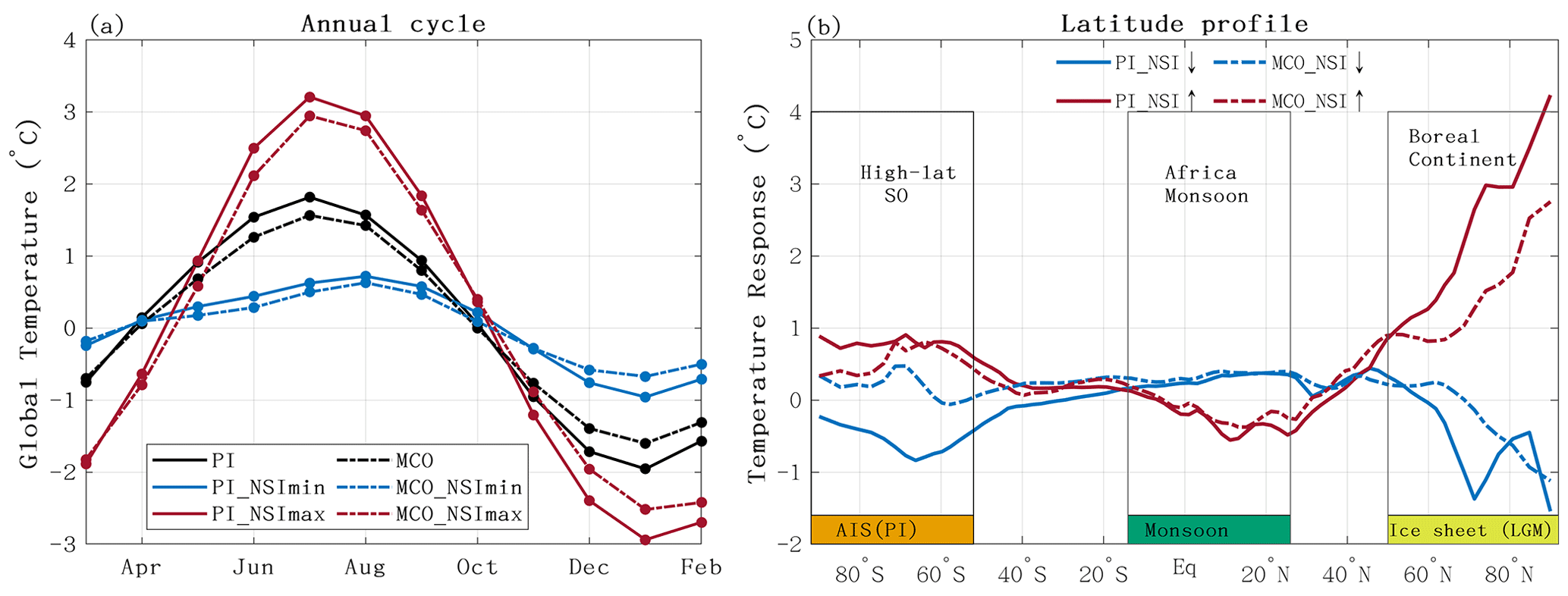 Figure 2(a) Annual cycle of temperature anomalies relative to the annual mean, with black, red and blue lines representing baseline, NSImax and NSImin simulations, respectively. Solid lines denote the PI climate, and dashed lines denote the Miocene climate. (b) Latitude profile of temperature response to orbital forcing, shown as anomalies to their baseline simulation and using the same color scheme as in (a). The locations of modern Antarctic Ice sheet (AIS), major monsoon regions and the Last glacial maximum Ice sheets are indicated in (b).
