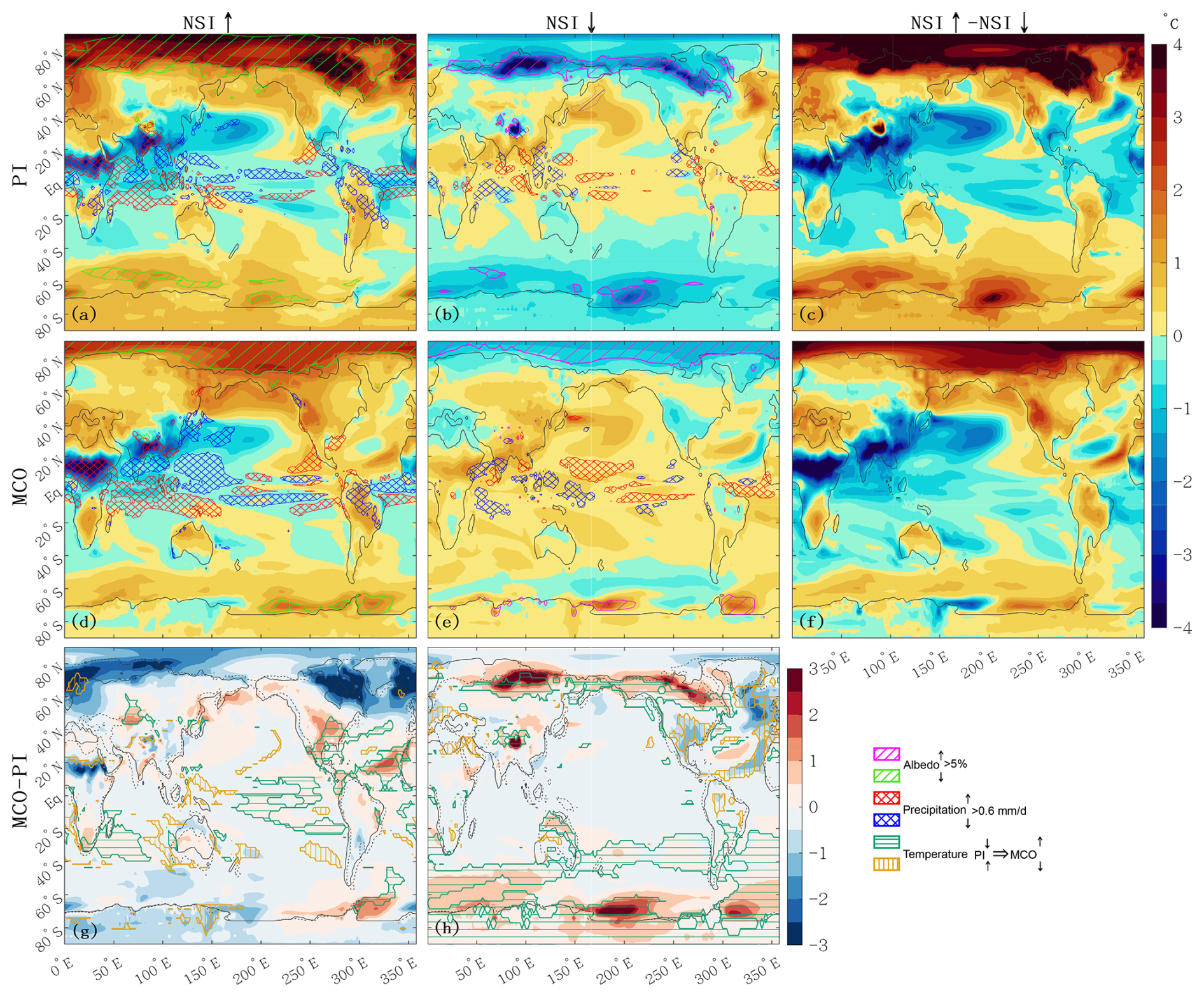 The NSImax and NSImin simulations show overall anti-phased annual mean temperature responses (Fig. 3). Compared to the MCO and PI baselines, NSImax simulations show a dipole pattern, with polar warming but cooling in the tropics and subtropics of both hemispheres. Conversely, NSImin simulations show high-latidue cooling, alongside extratropical and tropical warming that extending up to ∼60° N and 40° S. Similar high versus low-latitude contrasts have been reported in simulations of interglacials characterized by high obliquity and precession, such as Mid-Holocene (Brierley et al., 2020; Dai et al., 2024) and other interglacials (Yin et al., 2012; Herold et al., 2012). These patterns are primarily related to the change in obliquity and precession, and are further amplified by feedback including high-latitude albedo changes and shifts in the tropical hydrological cycle (Figs. S7 and S8).