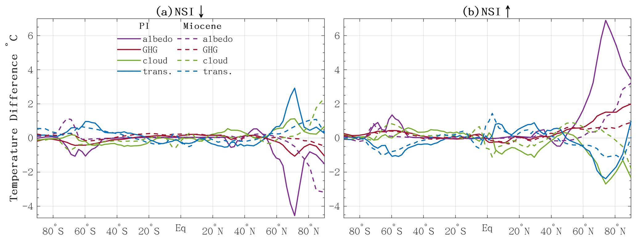 Beyond differences in magnitude, the spatial extent of warming and cooling response also differs between the PI and Miocene simulation. Under PI conditions, high-latitude temperature responses are largely symmetric between NSImax and NSImin. In contrast, the Miocene simulations show warming in both MCONSImin and MCONSImax over Siberia and Alaska, resulting in distinct regional responses across 60–70° N spanning Eurasia, Alaska and North America continent (Fig. 3e, green line). Similarly, the Weddell Sea and Ross Sea exhibit overall warming in both Miocene orbital simulations, deviating from the symmetric PI behavior (Figs. 3 and S11). These deviations suggest a less symmetric and less predictable Miocene response, likely consistent with proxy evidence for dominance of longer-period orbital variability (e.g. the 400 kyr) rather than 40 and 100 kyr cycle characteristic of the Pleistocene (Holbourn et al., 2007; Tian et al., 2013; Westerhold et al., 2020; Liu et al., 2024). This also implies that simple NSImax minus NSImin, without examining spatial patterns in detail, can obscure nonlinear responses – particularly under warmer background conditions.