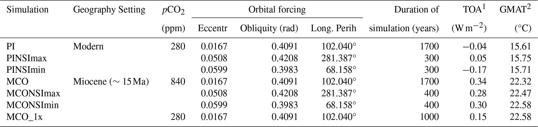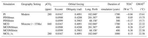 Both PI and MCO baseline simulations were each run for 1700 years to reach quasi-equilibrium. The orbital simulations were then branched from the year 1601th of the corresponding baseline runs and integrated for additional 300 (PINSImax, PINSImin) and 400 years (MCONSImax, MCONSImin), respectively. Over the final 100 years of each experiment, the global mean top-of-Atmosphere (TOA) radiation imbalance within (Table 1).